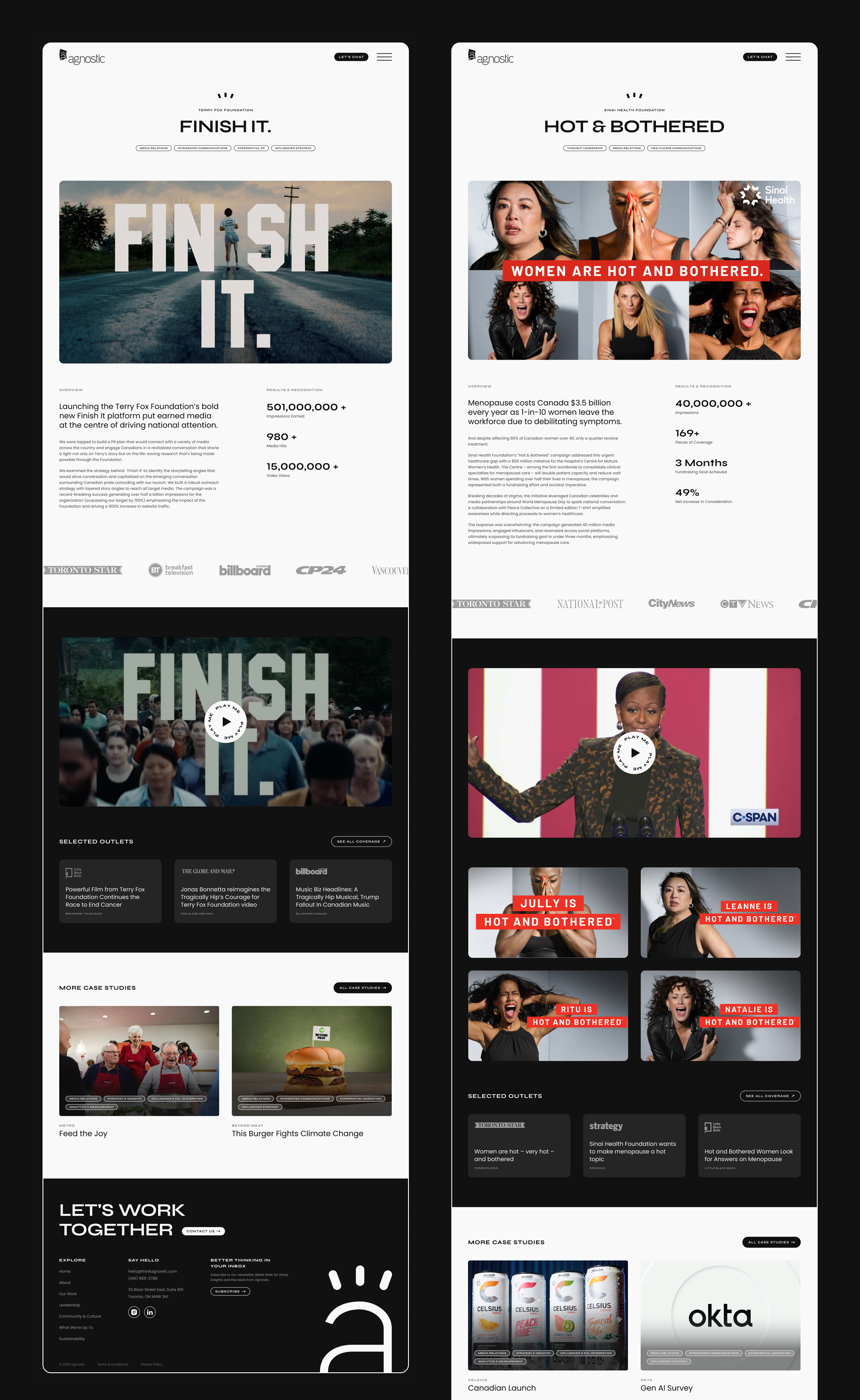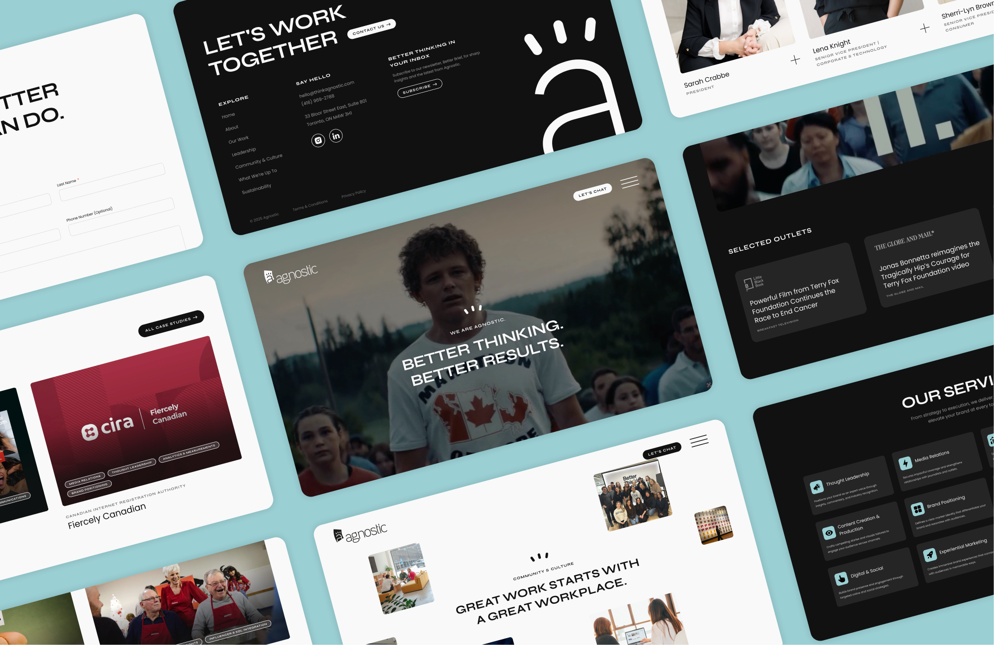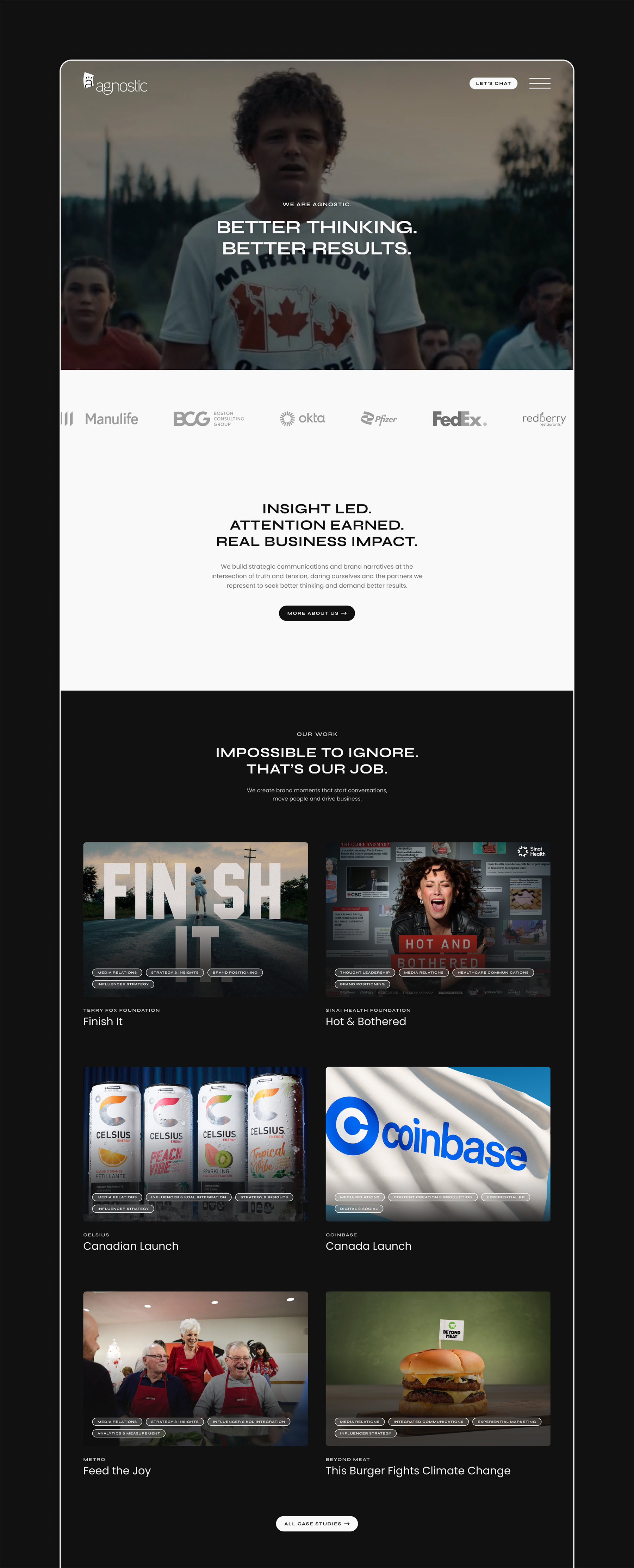 Agnostic is one of Canada’s leading strategic communications agencies, known for challenging conventions and bringing human truth into every brief. Our goal in redesigning their website was to translate that spirit into a digital experience. One that feels as sharp and sophisticated as their work, while making it easier for prospective clients to explore the agency’s thinking and results.